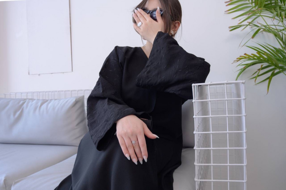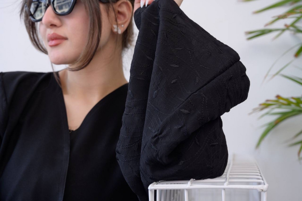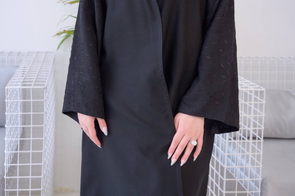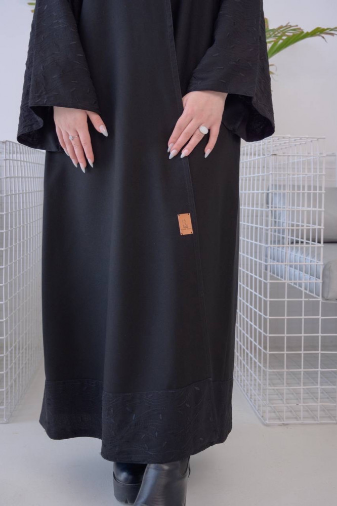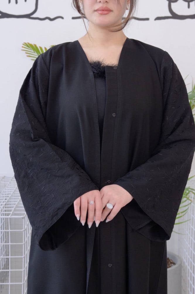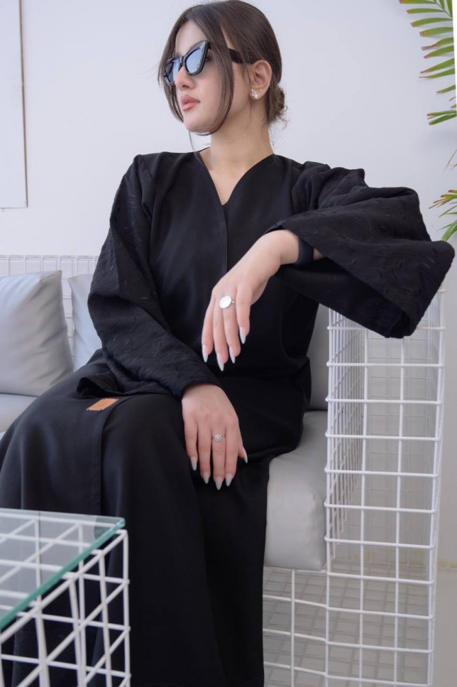 قماش كريب واقف ، القماش يتميز بالفخامة والسواد الفاحم ، لا يحتاج إلى كوي إذا تم اخراج العباية بعد الغسيل مباشرة ونشرها