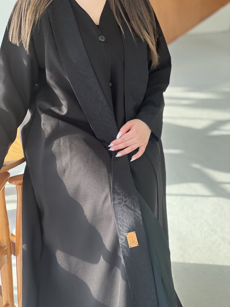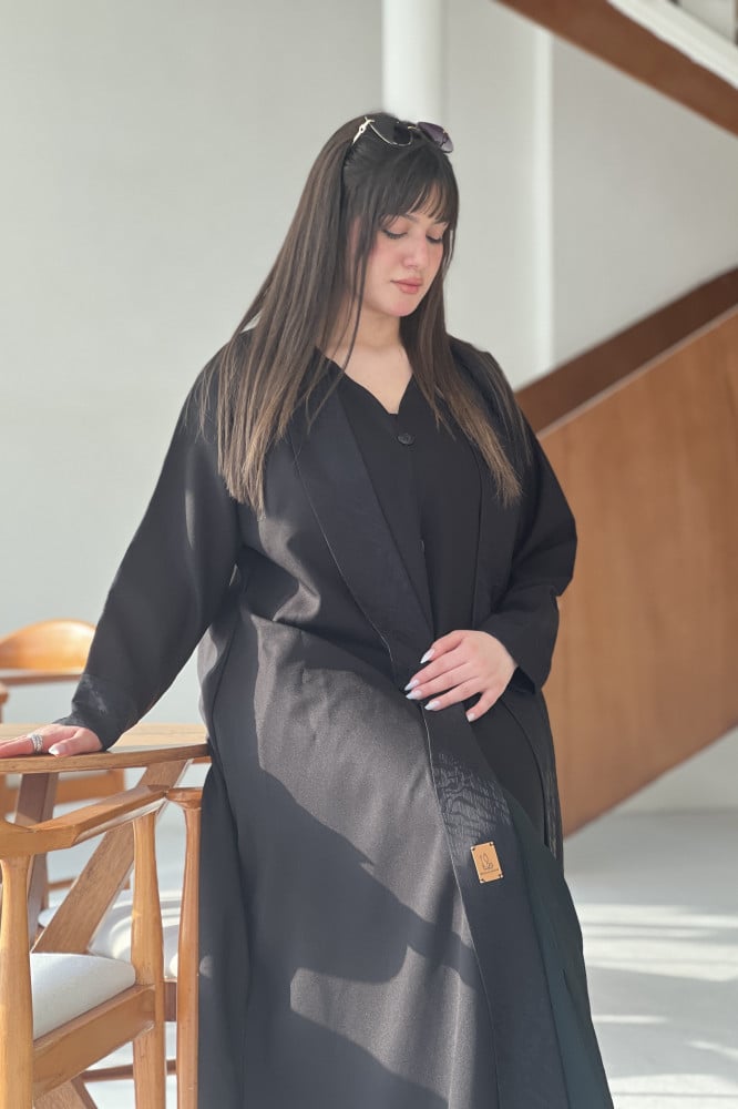 قماش كريب واقف ، متصله بفستان داخلي ، القصه نص كلوش ، يمتاز القماش بالسواد الفاحم