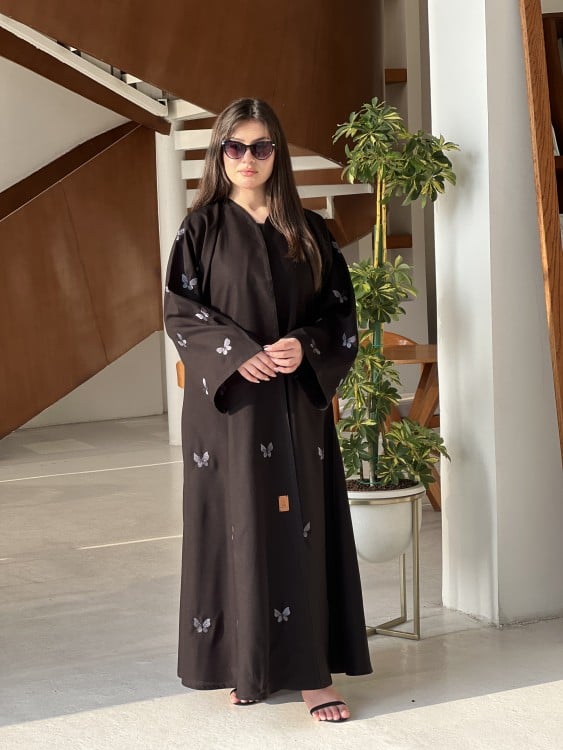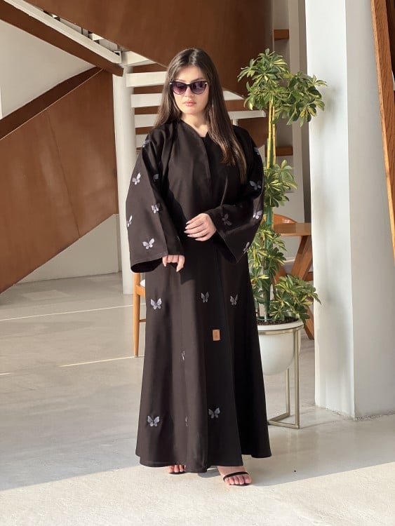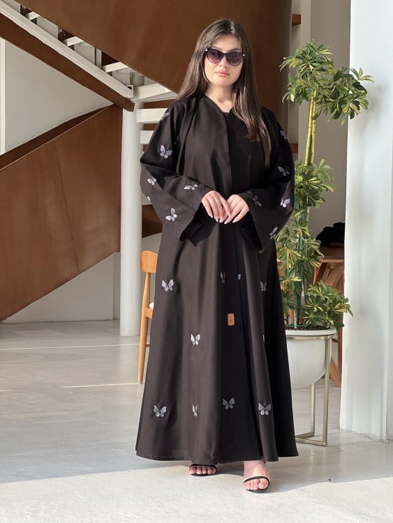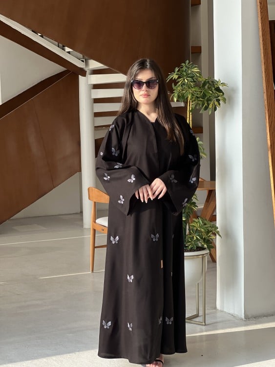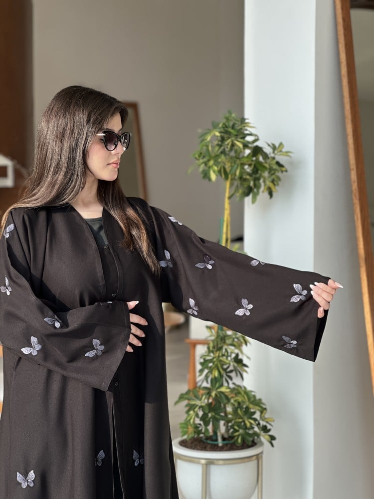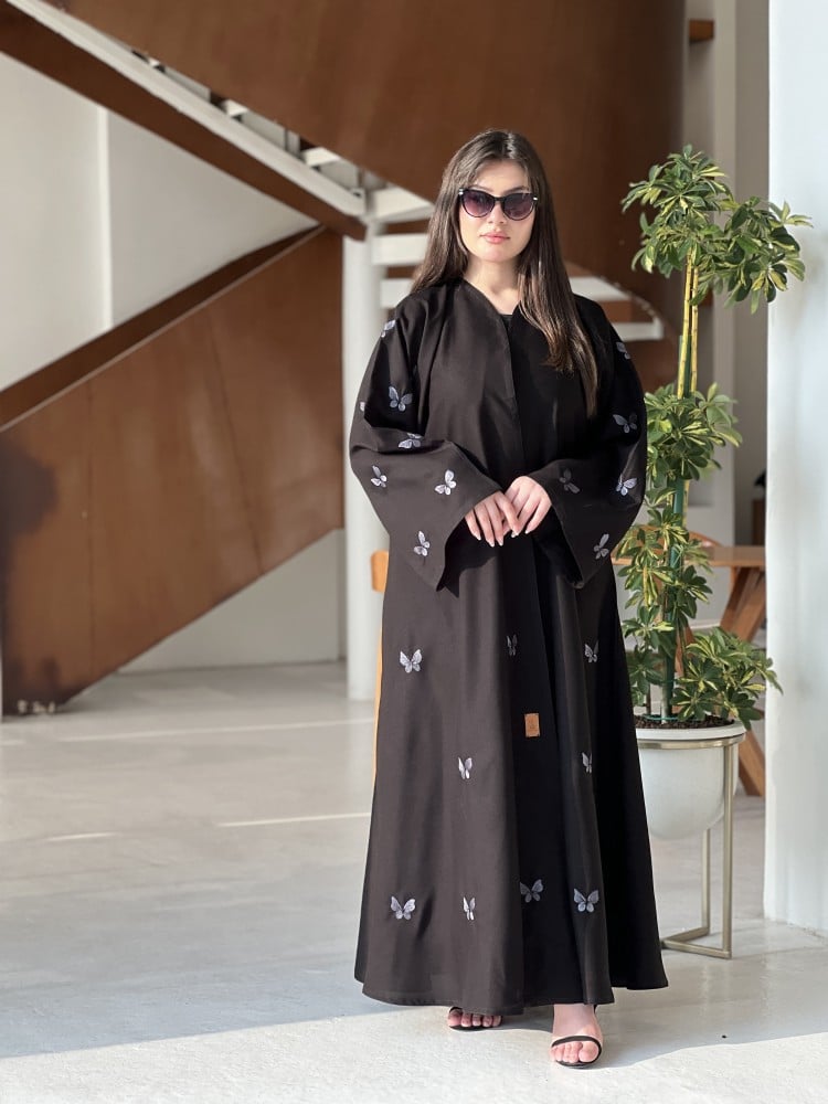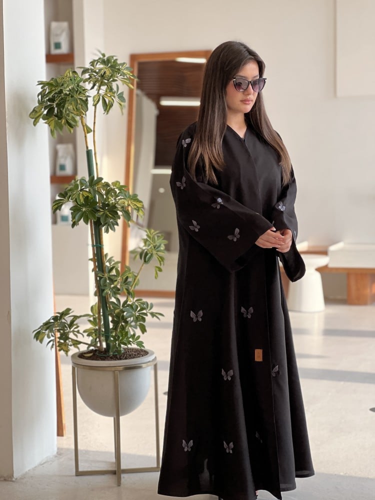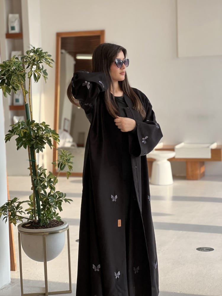 قماش كريب واقف ، مغلقة بازارير ، القصه نص كلوش ، مطرزة بفراشات جميلة عند الاكتاف ومن اسفل العباية و حمى المنتصف كما موضح في الصور ،