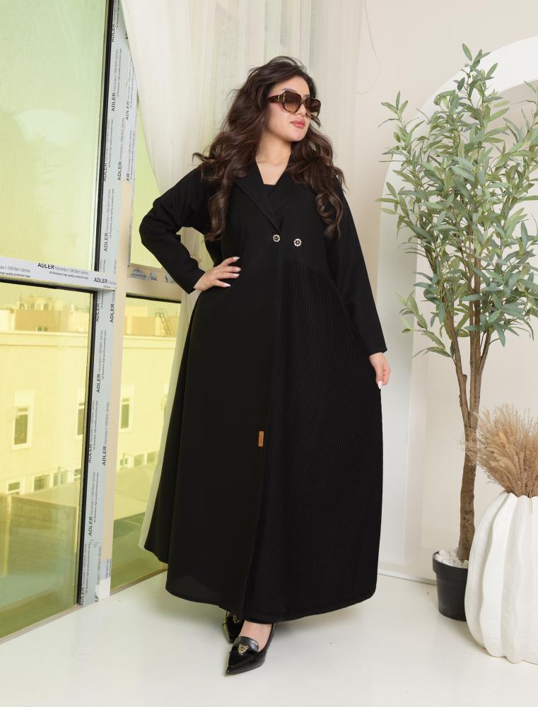 قماش كريب واقف يمتاز بالسود الفاحم, ياقة أمامية مع ازارير راقيه باللون الذهبي والاسود , بالاضافة الى قماش كسرات من المنتصف إلى الاسفل في جهة اليمين ليعطي طابع مميز وأنيق كما موضح في الصور ، قصة كلوش تنسدل بشكل أنيق وجميل.