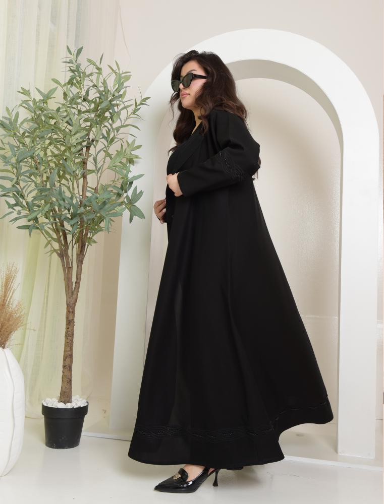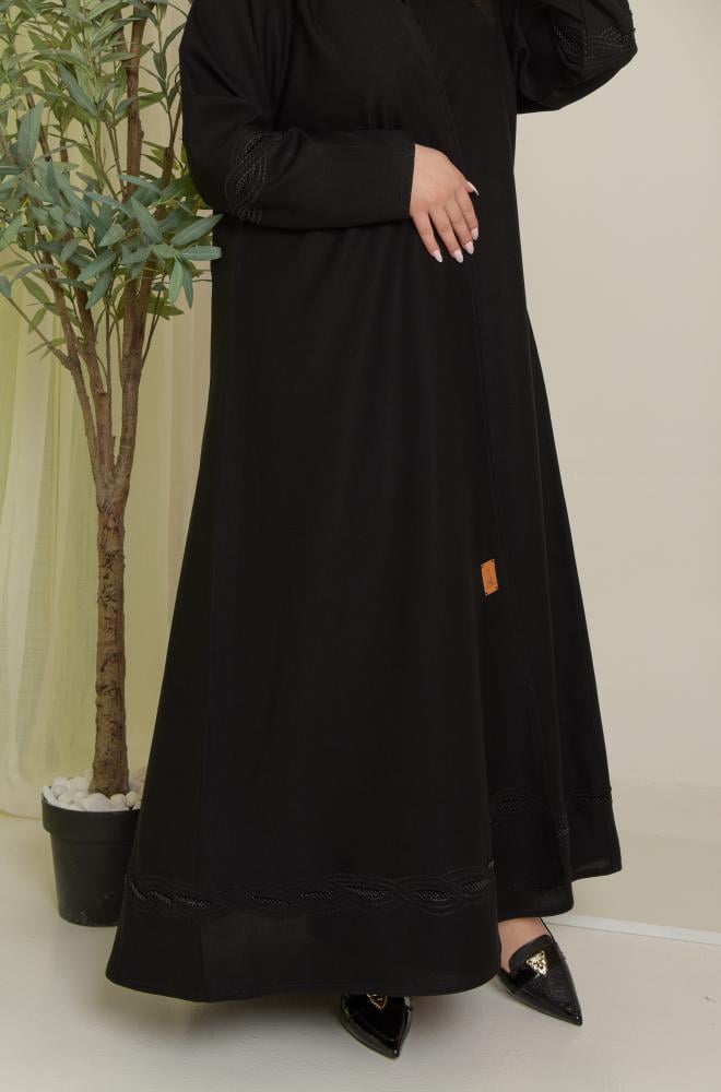 تطريز متداخل باللون الاسود يتوسطه شك أسود يدوي راقي في الاكمام واسفل العباية، قصة نص كلوش تنسدل بشكل أنيق وجميل.
