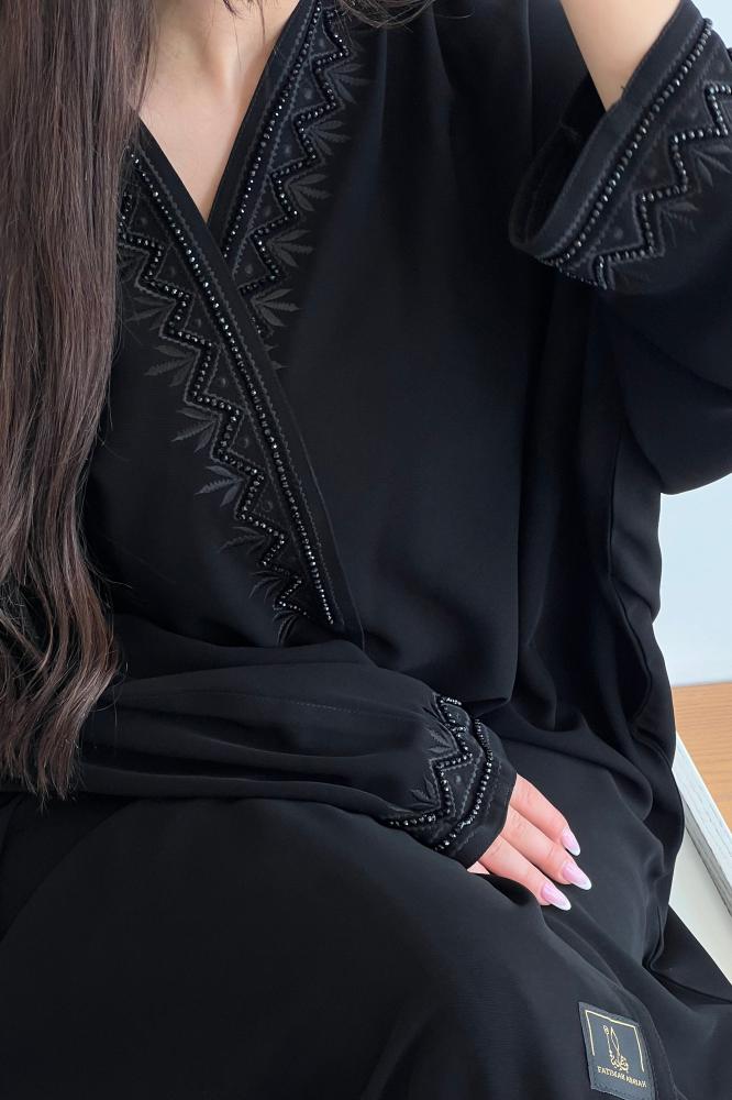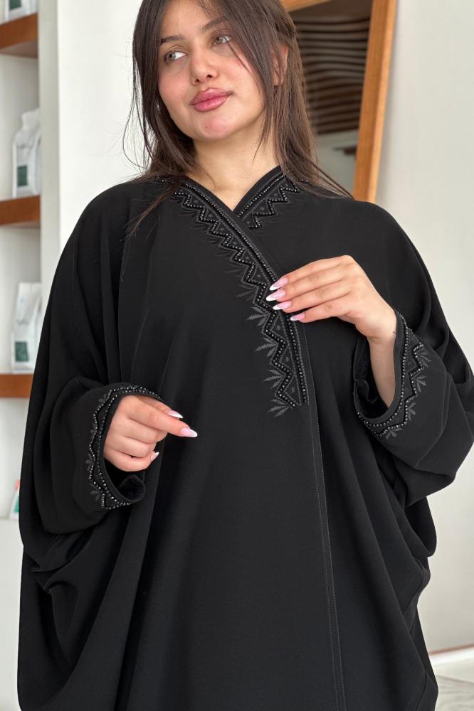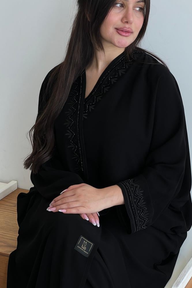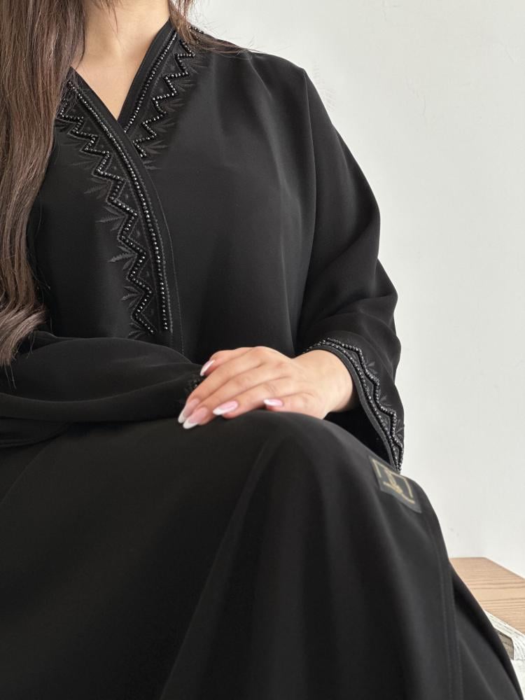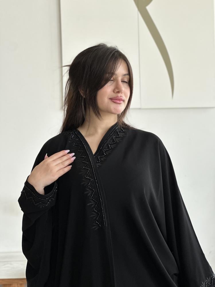 قماش كريب ملكي طايح يتميز بالفخامة والسواد الفاحم لا يحتاج الى كوي، عباية نص بشت اسود عملية و أنيقة و مريحة تتميز بتصميمها العملي والعصري، تأتي بقصة واسعة و مريحة تسمح بحرية الحركة مع مطاط داخلي لتثبيت العباية من الداخل، مزودة بتطريز أسود وشك يدوي راقي ليضفي لمسة من الحيوية والجاذبية.