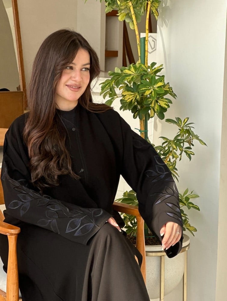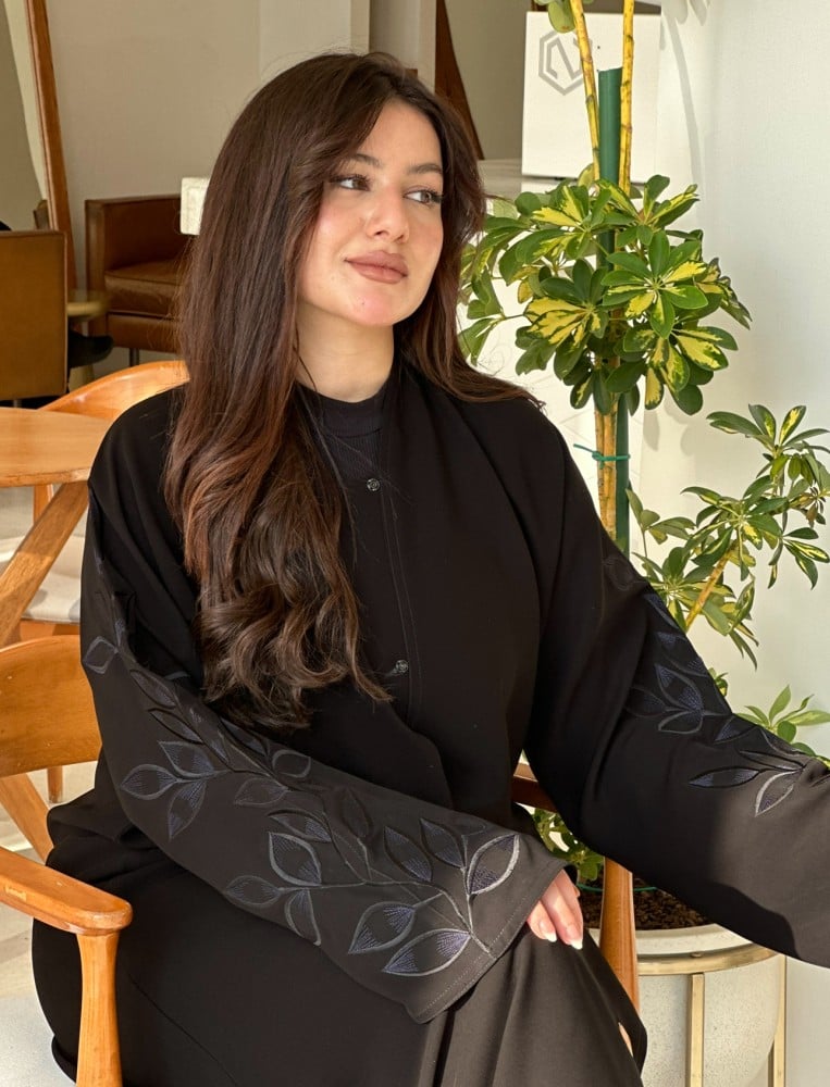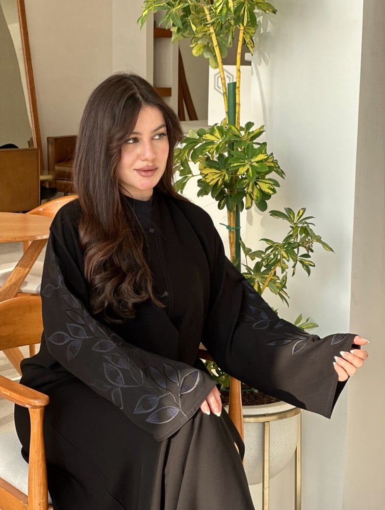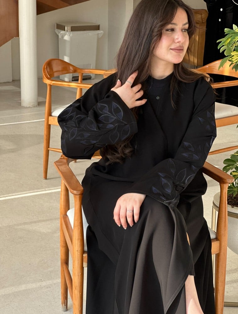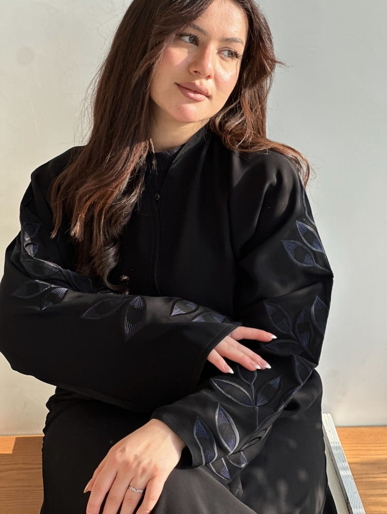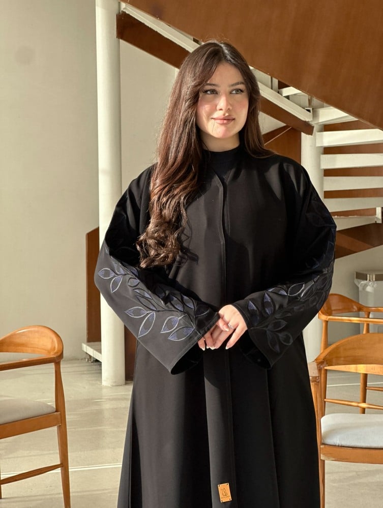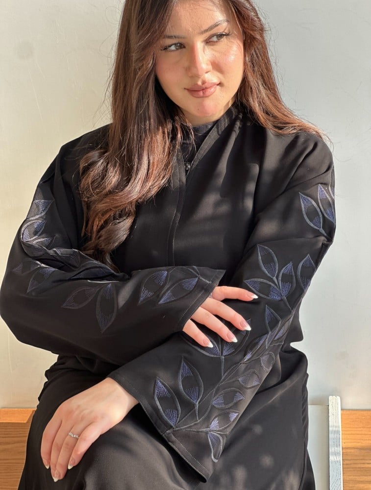 قماش اندونيسي طايح .. مغلقة بطقطق .. أكمام مطرزة باوراق شجر باللون الاسود والكحلي كما هو موضح في الصور .. قماش عملي ..