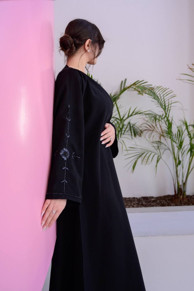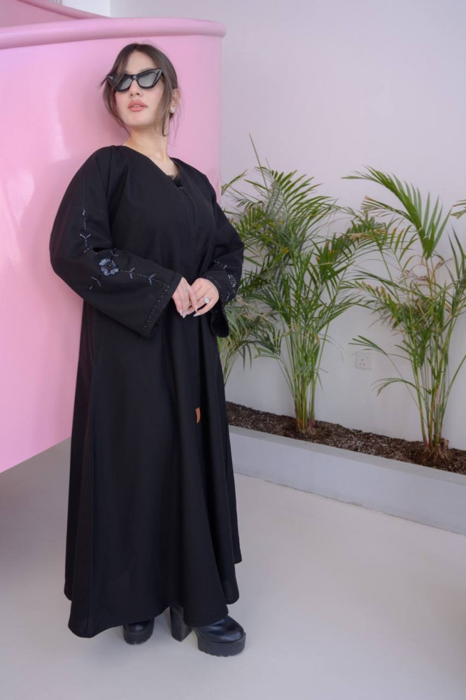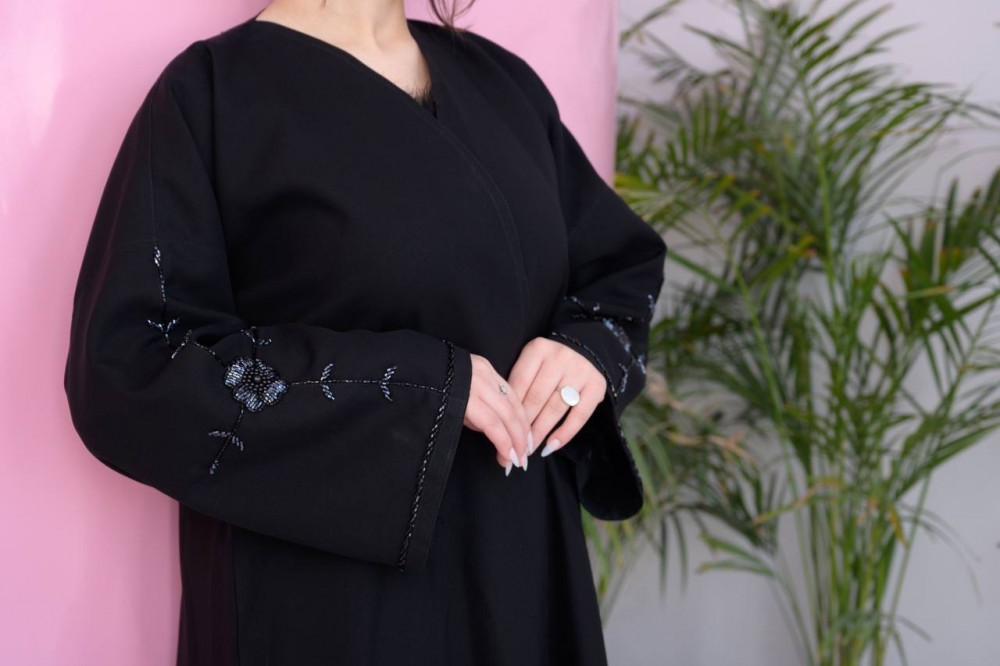 قماش كريب واقف ، القماش يتميز بالفخامة والسواد الفاحم ، لا يحتاج إلى كوي إذا تم اخراج العباية بعد الغسيل مباشرة ونشرها