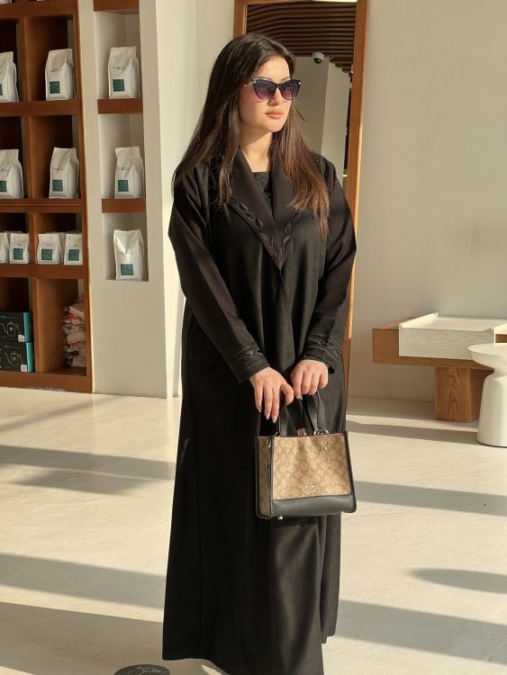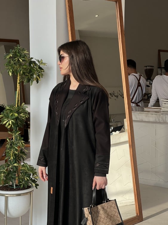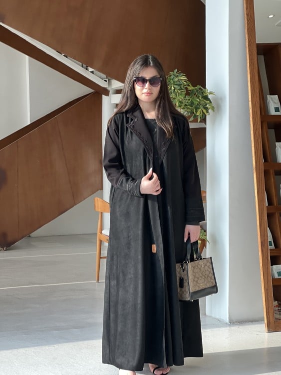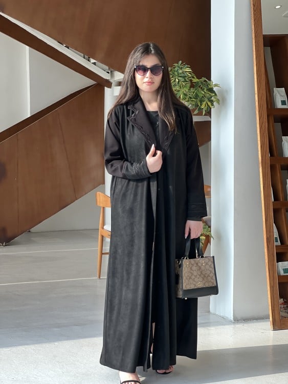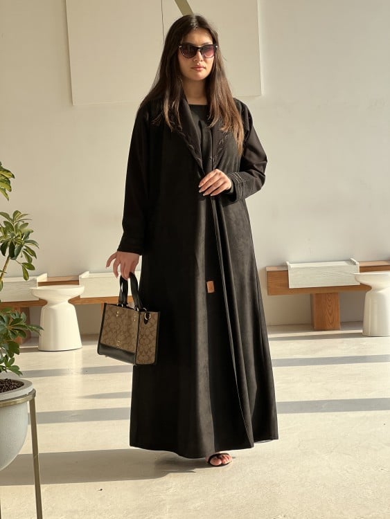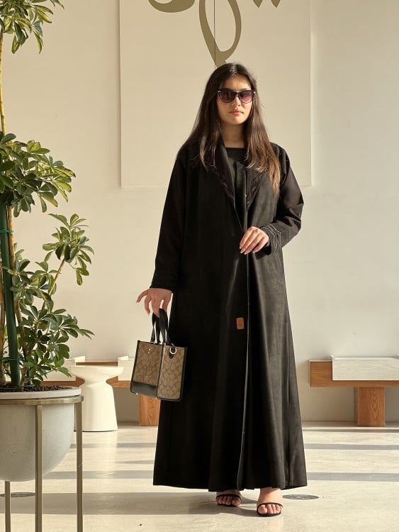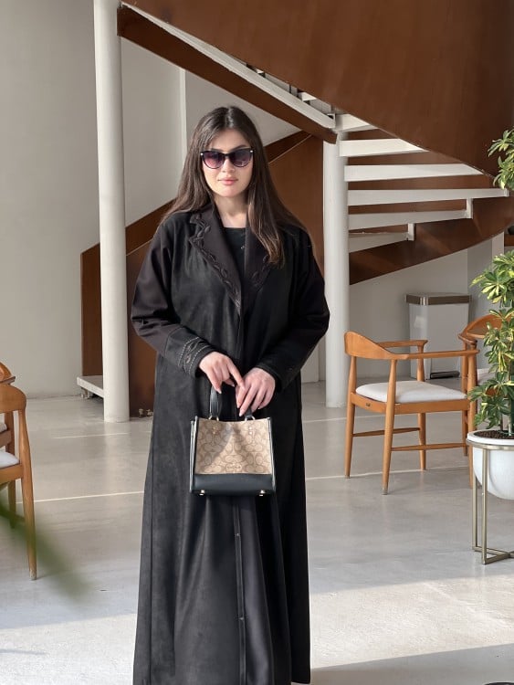 قماش شامواه اسود شتوي ، مغلقة بازارير ، القصه نص كلوش ، الياقة قماش واقف مطرزه كذلك الاكتاف قماش واقف والاكمام قماش شامواه كما موضح في الصور ، مع امكانية طلب العباية مفتوحة بدون ازارير